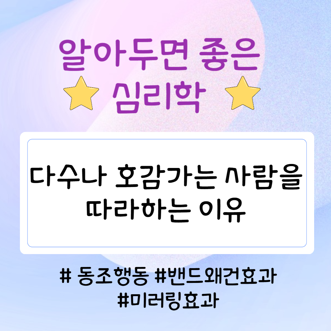 오늘은 사람들이 다수를 따라하거나 좋아하는 사람의 행동을 따라하는 이유와 관련된 심리학 효과를 설명해드리겠습니다.